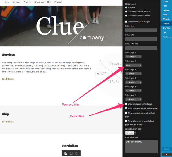 Select the theme menu, remove the Blog under Page 2, and check “Show latest posts on front page.”