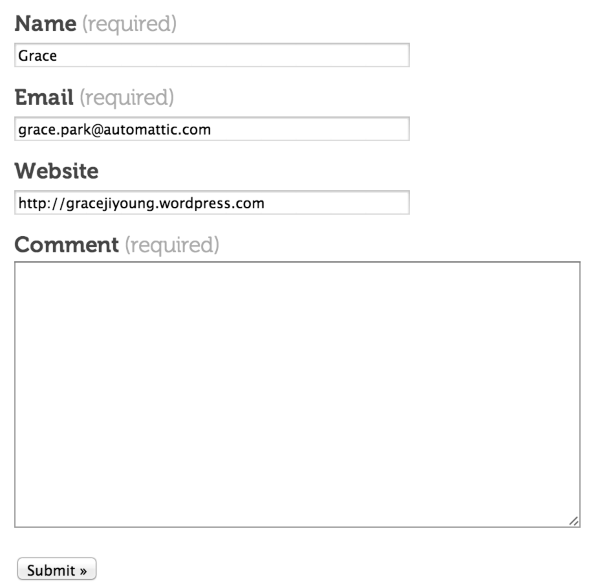 So, if your readers were to view your contact page (and they are logged into their WordPress.com account) their info would appear there. If they are not signed in, it will not be pre-filled. As seen in the screenshot above, I am signed into my WordPress.com account, so it’s pre-filled with my info.