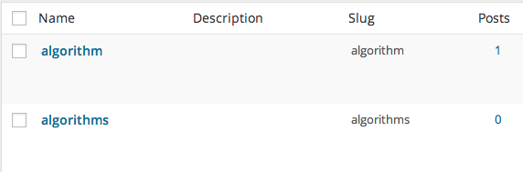 I did not see an algorithm Category, but I noticed that you have both algorithm and algorithms Tags: