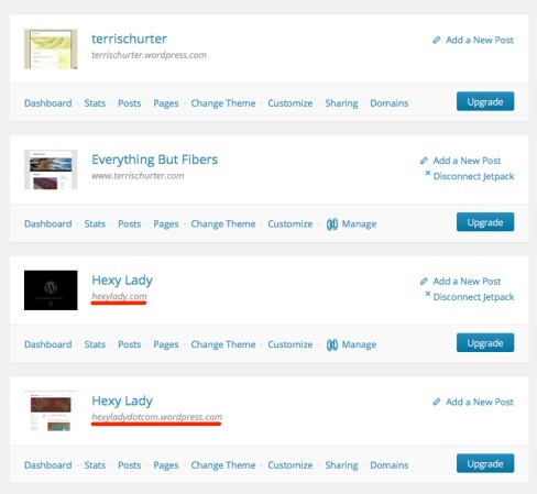 I suspect that I should make hexyladydotcom.worspress.com the primary domain if I want to be able to access it with it’s full url. But then what happens to hexylady.com? I don’t want hexylady.com redirecting to hexyladydotcom.wordpress.com. That would be a disaster. I don’t want to make this change if something bad will happen.