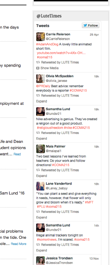 You have sharing button for Twitter on your posts http://lutetimes.com/2013/11/12/dressing-on-halloween/See here for using the Twitter timeline widget on a free hosted WordPress.com blog > http://en.support.wordpress.com/widgets/twitter-timeline-widget/