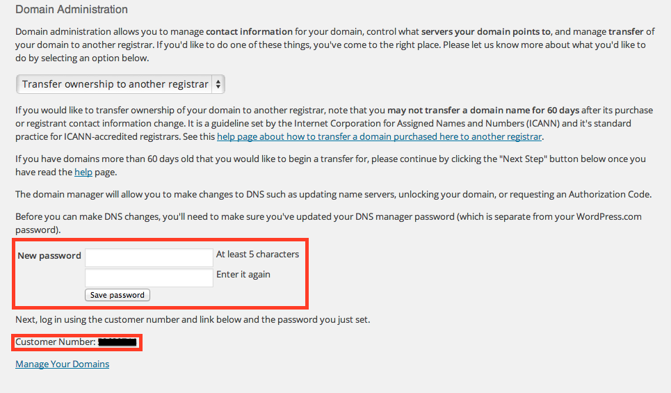 I’m happy to help! You can find the Domain Manager through your dashboard at Store > Domains. You’ll need to scroll down and select ‘Make changes to DNS.’ And then set a new password. Save and select the same from the drop down menu. This time, copy your customer number and click on ‘Manage Your Domains’: