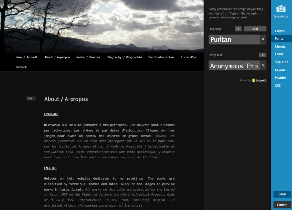 #branding #searchform { display: none; }As for the fonts, I found that I was able to change the fonts of pages, for example the About page, as seen in the screenshot below: