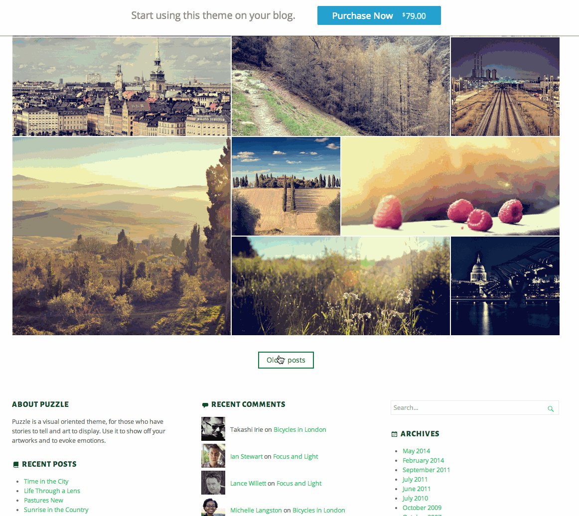 I’d like to maybe purchase the Puzzle theme as I really like the front page look. Am I right in thinking that I can set it up so that when a user clicks on Older Posts that same format will be replicated. When I go to older posts in the preview it is just a list and does not have a nice look at all. Thanks in advance.