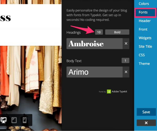 Adjust the font size by clicking on “Fonts” and change the number next to headings:
