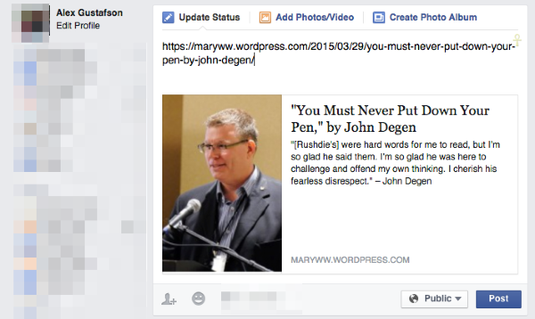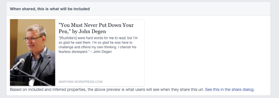 I cannot get this wordpress post: https://maryww.wordpress.com/2015/03/29/you-must-never-put-down-your-pen-by-john-degen/ to post the right image to Facebook. Facebook chooses the 3rd (!) widget image (not the first, not the second, not the header) and gives me two other incorrect images as options. I want the image of John Degen. After reading your forums, I changed the size of the image Facebook insists on showing (3rd widget: Success After 60) so that it is smaller. Then I increased the size of the image of John Degen so that it is above the lower limit for images accepted by Facebook (it is now 250 x 227). Then I set John’s image as the “featured image” for this post. But it STILL shows the Success After 60 image. I even shut down WordPress, Facebook, the browser and the computer. No improvement. Then I tried uploading the image of John Degen directly to Facebook from by desktop then adding a link to the blog post and the blog post doesn’t show up on facebook, just the http link.